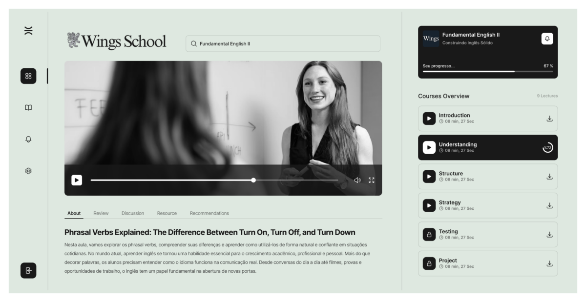 O aluno que passa pela Wings School não é treinado para um teste. Ele é exposto um volume generoso de ideias, textos, áudios, debates e produções em inglês.
