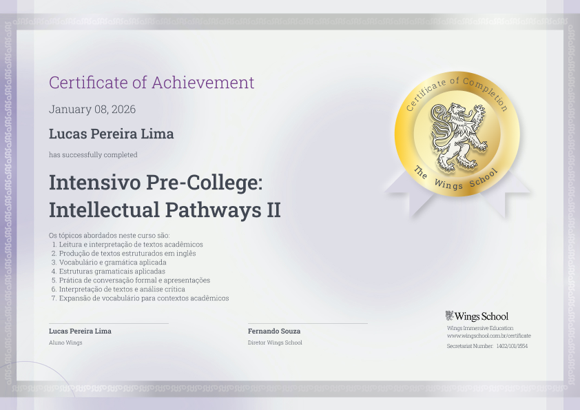 Aprender inglês através de temas que fascinam. Literatura, cinema, sociedade, ciência significa que o cérebro está engajado. E um cérebro engajado aprende mais rápido, retém por mais tempo, e usa o que aprendeu com mais naturalidade.